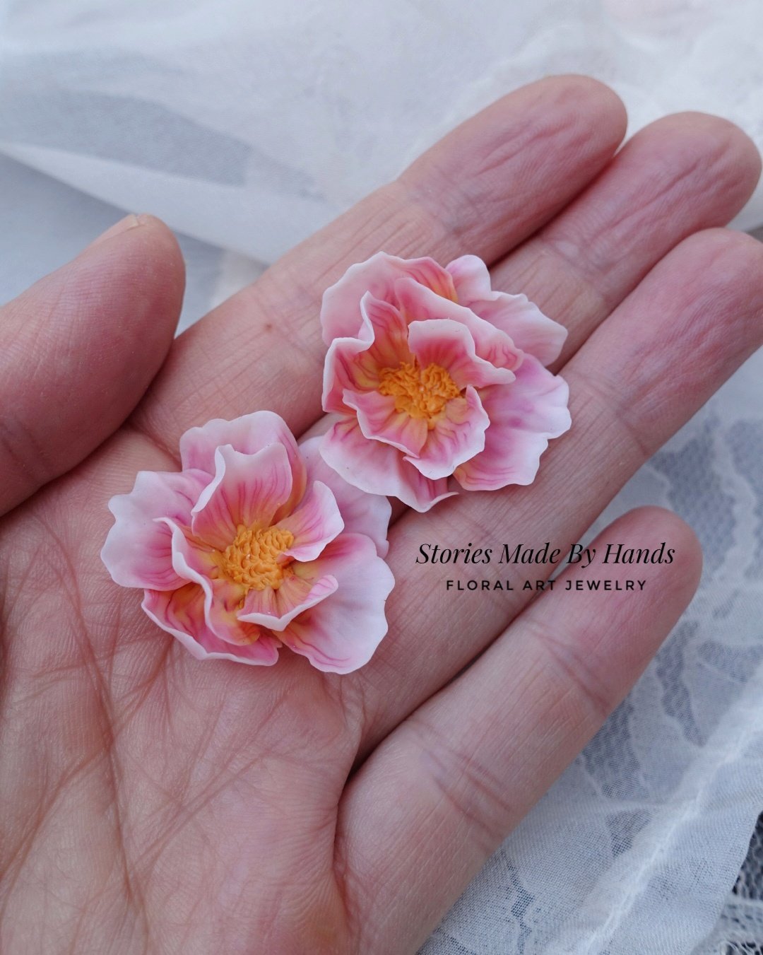 Every petal is handcrafted. The diameter of the flower is approximately 2.5cm and very lightweight. Ear stud is made from gold filled brass.